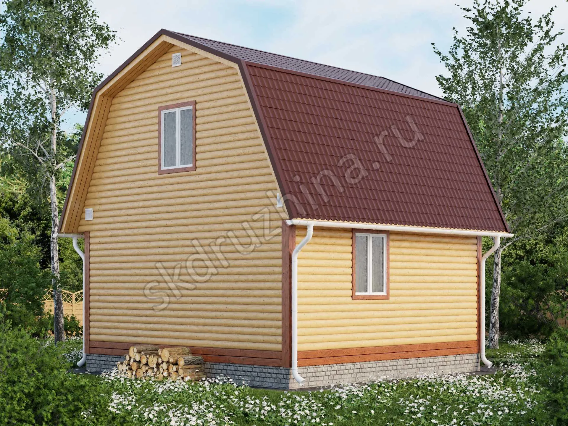 профилированный брус 90×140 мм, 140×140 мм или 190х140 мм (атмосферной сушки), с наружней стороны прямой или под блок-хаус, с внутренней — прямой.