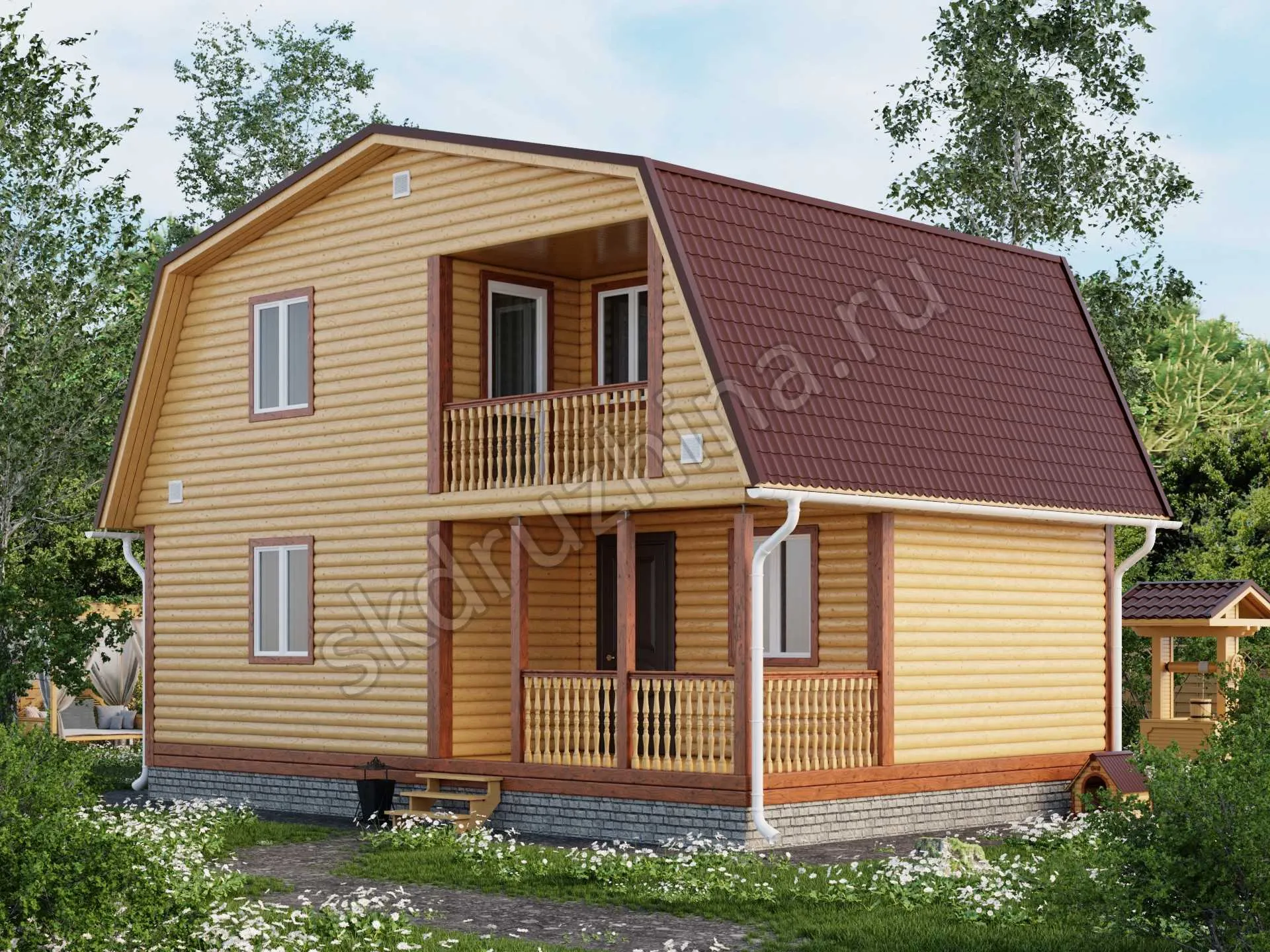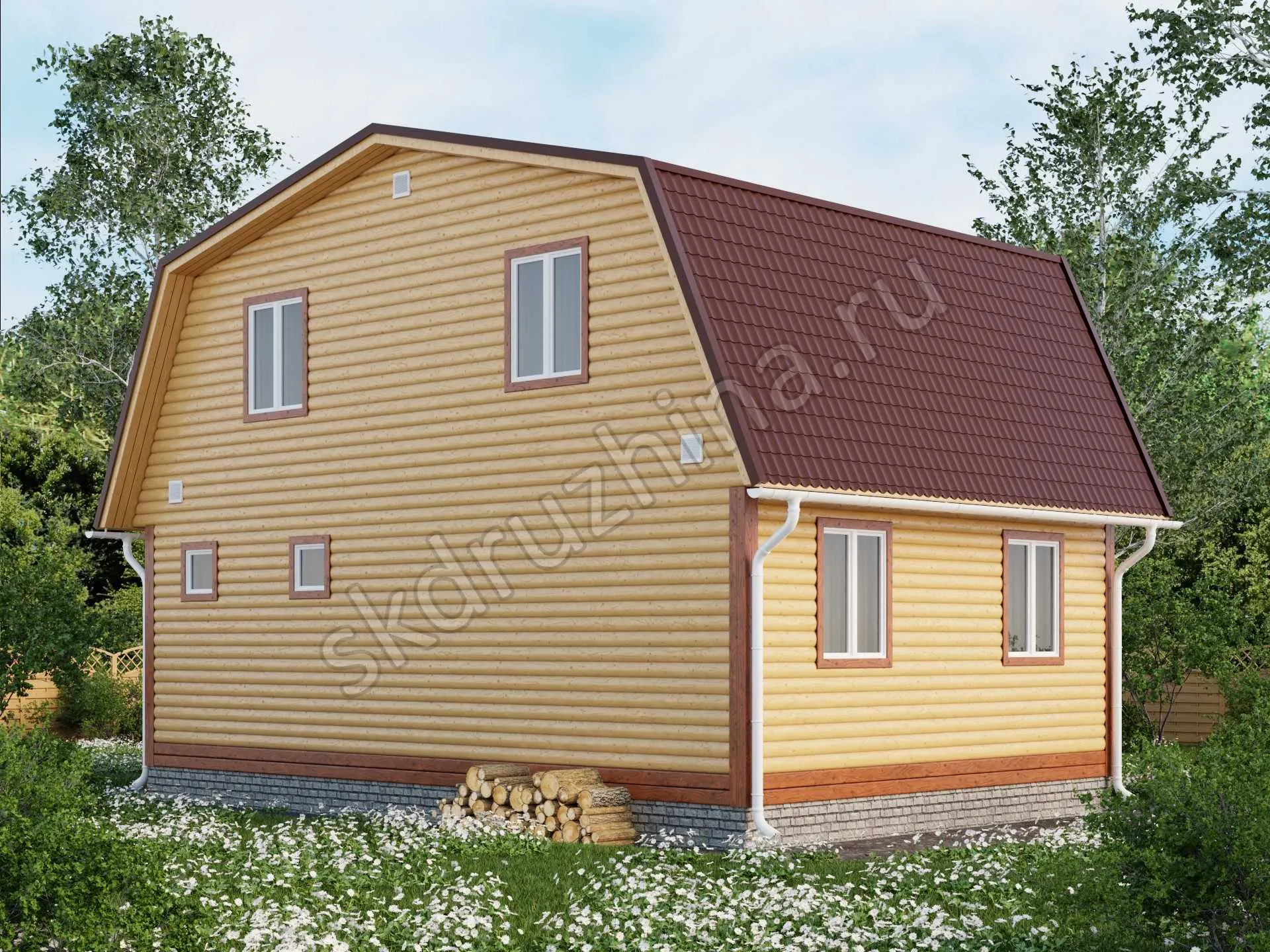 профилированный брус 90×140 мм, 140×140 мм или 190х140 мм (атмосферной сушки), с наружней стороны прямой или под блок-хаус, с внутренней — прямой.
