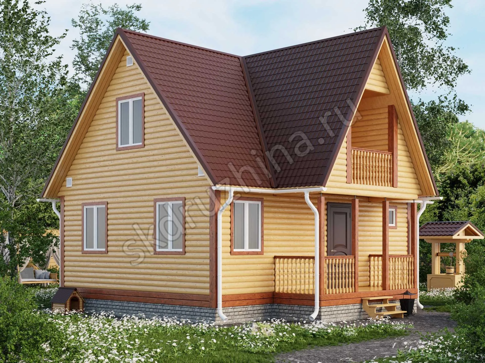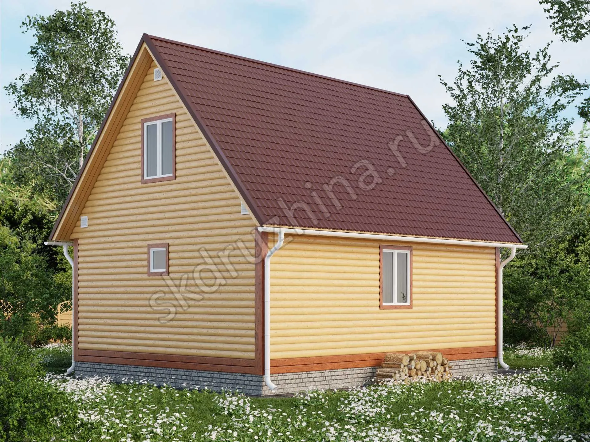 профилированный брус 90×140 мм, 140×140 мм или 190х140 мм (атмосферной сушки), с наружней стороны прямой или под блок-хаус, с внутренней — прямой.